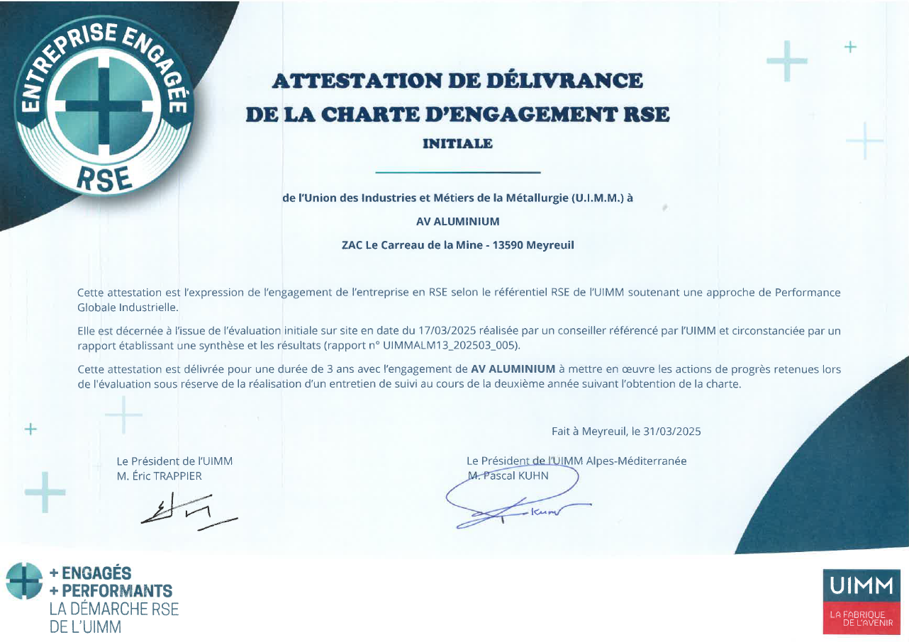 AV Aluminium a obtenu la certification Engagement RSE délivrée par l’UIMM, une reconnaissance officielle de nos actions concrètes en faveur du développement durable et du réemploi...